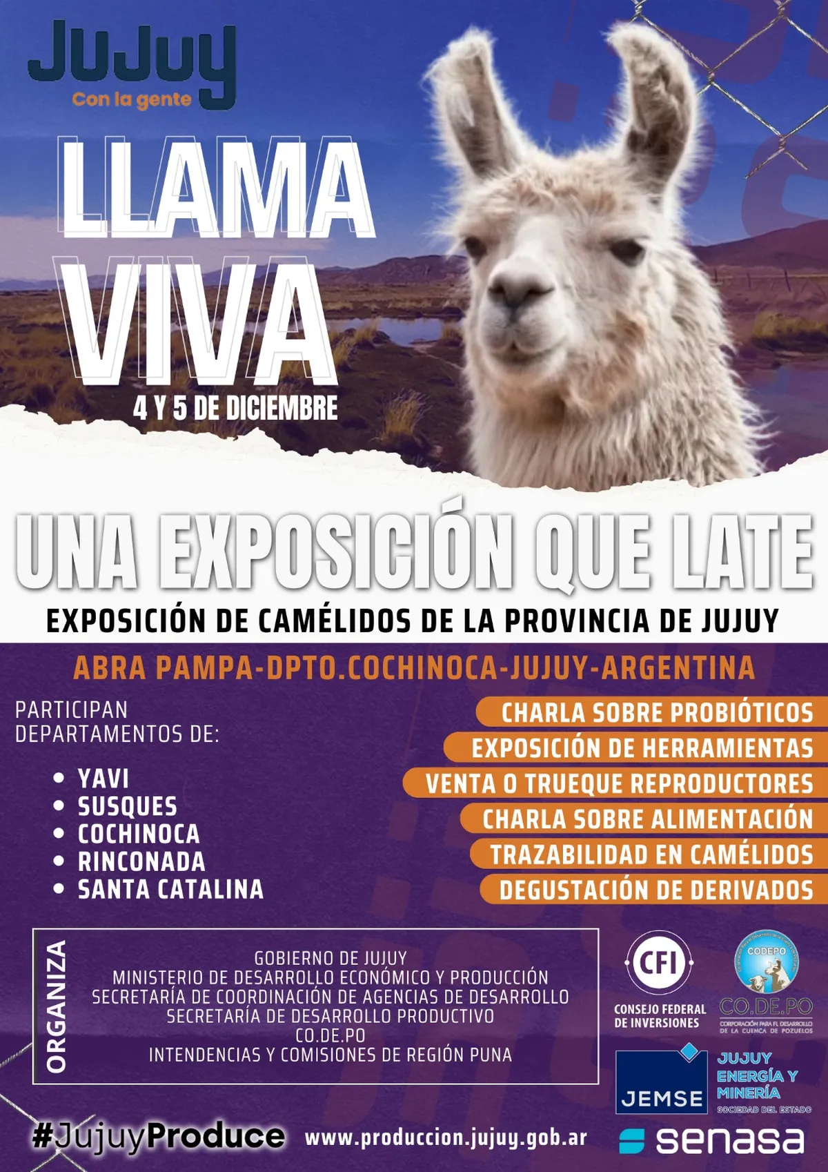 El 4 y 5 de diciembre, el gobierno de la Provincia, a través del ministerio de Desarrollo Económico y Producción, y junto a las comisiones municipales y municipios de la Puna, realizará en Abra Pampa la exposición «Llama Viva: una exposición que late», evento que busca promover prácticas sostenibles, aumentando la calidad de las crías y fortaleciendo el desarrollo de los criadores locales.