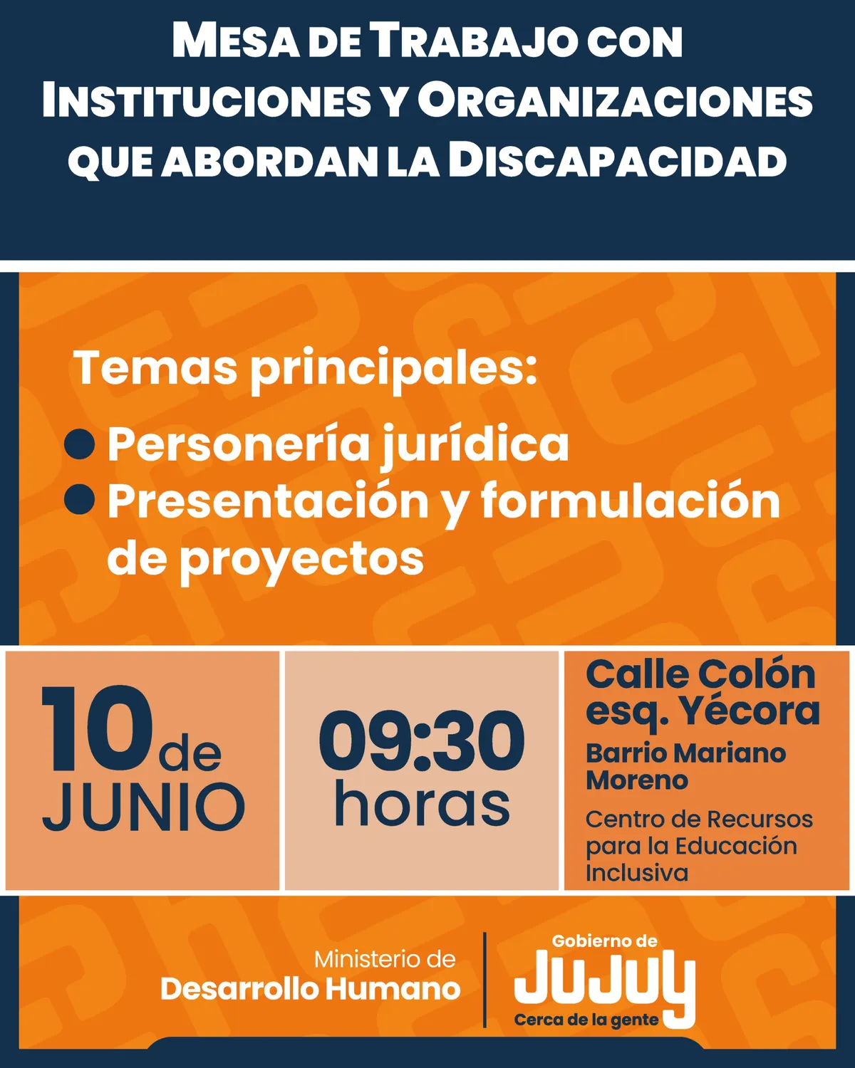 Mesa de Trabajo para instituciones que abordan la DiscapacidadLa actividad se realizará el martes 10 de junio a las 9:30 hs, en el Centro de Recursos para la Educación Inclusiva, y tiene como objetivo brindar orientación técnica sobre personería jurídica y herramientas para la formulación y presentación de proyectos.