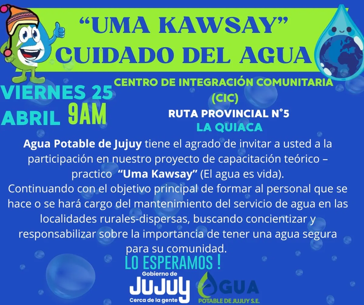 Agua Potable de Jujuy, en el marco del proyecto “Uma Kawsay”, hará una nueva capacitación destinada a fortalecer las capacidades y conocimientos en el manejo responsable del recurso hídrico en Abra Pampa. Esta nueva jornada se llevará a cabo el próximo viernes 25 de abril a las 9 am en el Centro de Integración Comunitaria (CIC) ubicado en Ruta Provincial Nº 5.