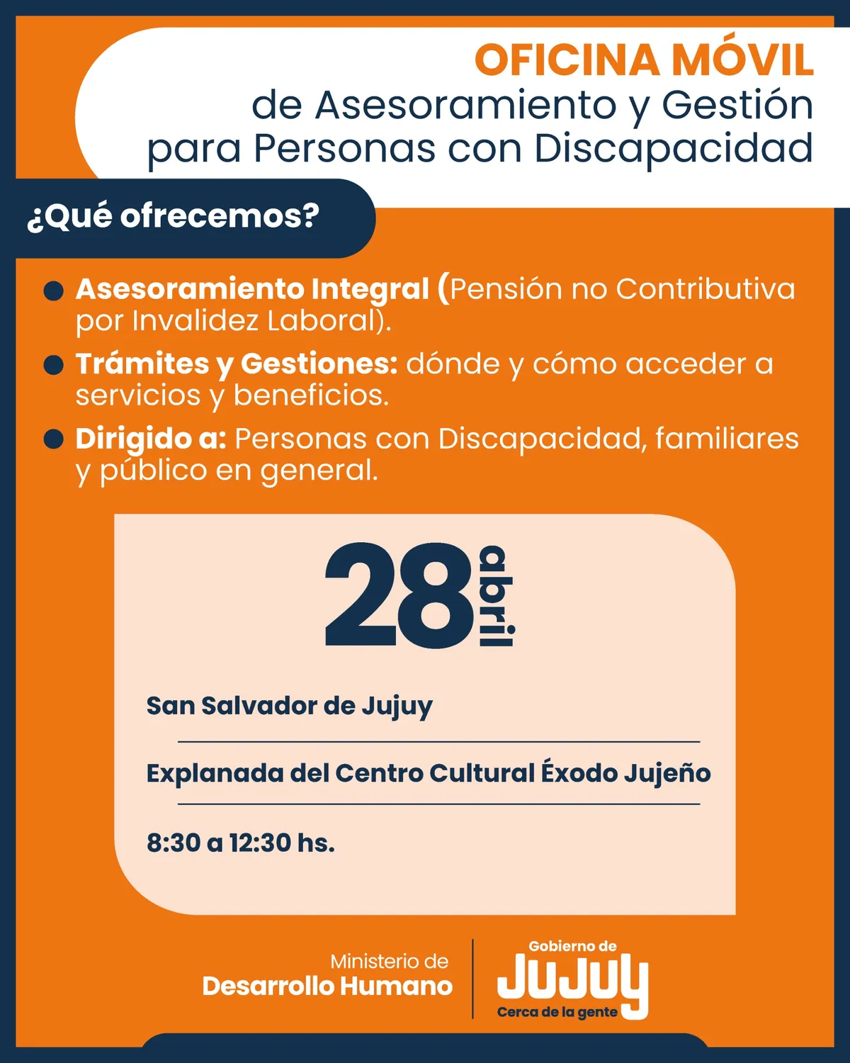 El Ministerio de Desarrollo Humano, a través de la Dirección Provincial de Inclusión de Personas con Discapacidad (dependiente de la Secretaría de Desarrollo Integral), brindará asesoramiento y acompañamiento gratuito a personas con discapacidad, familiares, instituciones y al público en general.