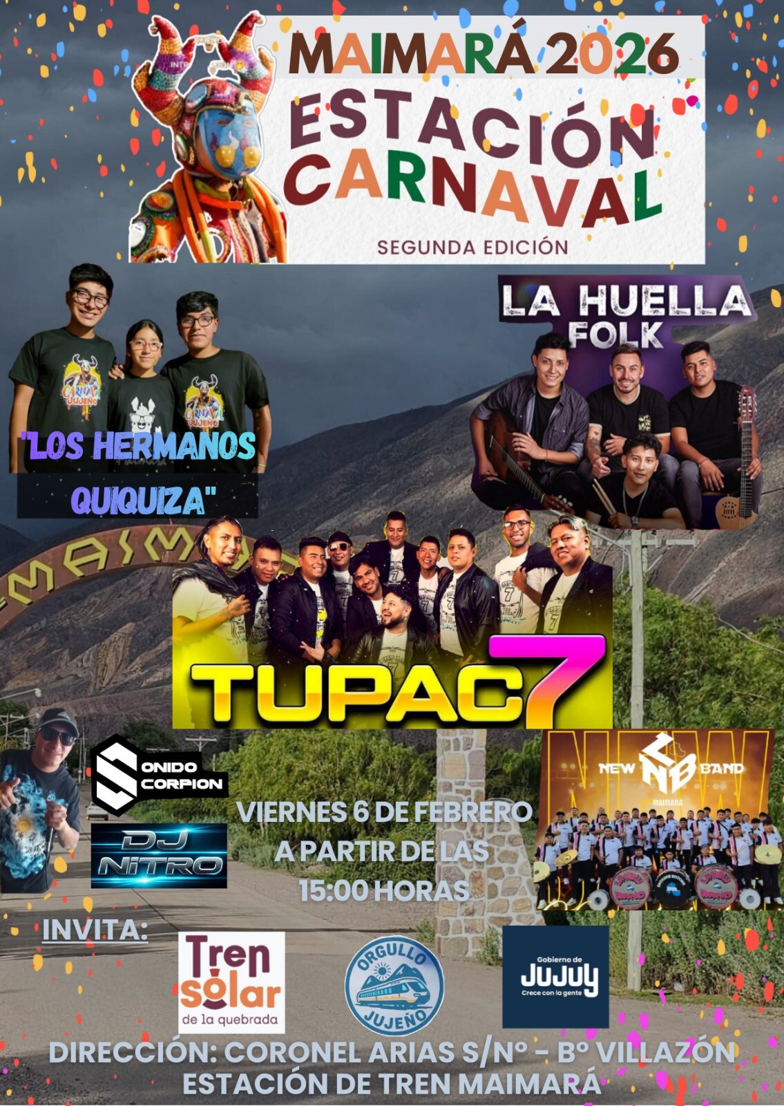 Será una tarde a toda fiesta en donde se desarrollará un Simulacro Carnavalero, también Chayada de Mojón de la estación para lo cual se contará con la presencia de los Anateros Maimareños, música en vivo con la New Band, La Huella Folk, entre otros. Tampoco podía faltar la vacuna carnavalera y como cierre, poniendo el broche de oro a esta fiesta actuará Tupac 7.